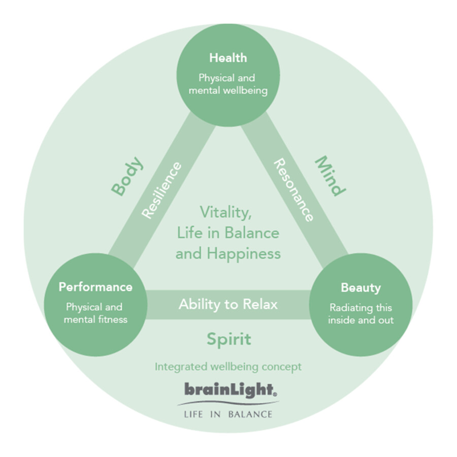 The holistic brainLight Well-Being-Concept shows a simple path to better health, performance, beauty, vitality and happiness. At the heart of this is the pursuit of balance and contentment. A balanced life in turn increases quality of life and joie de vivre. Our Well-Being-Concept reflects this principle by combining the essential components.